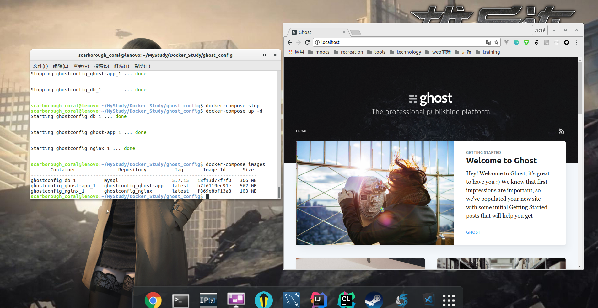 这是我用组合镜像工具搭建的一个本地博客,用到了nginx反向代理服务器,ghost博客镜像(npm包管理),还一个mysql镜像。